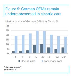然而,德國品牌在中國的電動汽車市場份額相當(dāng)?shù)?,多年來,德國品牌在中國乘用車銷量中占有相當(dāng)高的市場份額,約為23%。然而,到2021年和2022年,這一比例分別降至20.5%和19%。這可能是由于德國制造商受到上游產(chǎn)品短缺的影響比當(dāng)?shù)馗偁帉κ指鼑乐?,而中國制造商在更大程度上占?jù)了批量細分市場。