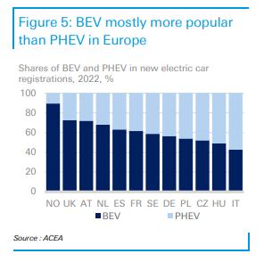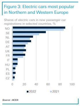 在歐洲,電動汽車增長勢頭強勁,2022年純電動汽車和插電式汽車市場份額為22.9%。在北歐,新注冊電動汽車的市場份額最高。電動汽車在東歐和南歐的市場份額仍然不足。購買價格高、收入低以及充電基礎(chǔ)設(shè)施不發(fā)達是造成這種情況的原因。