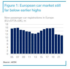 在需求方面,歐洲消費者的購買情緒最初受到疫情的抑制。自2022年以來,能源價格上漲、通脹問題以及利率上升對歐洲汽車消費也產(chǎn)生了負面影響。此外,全球供應(yīng)鏈出現(xiàn)了中斷,這抑制了全球乘用車生產(chǎn)。