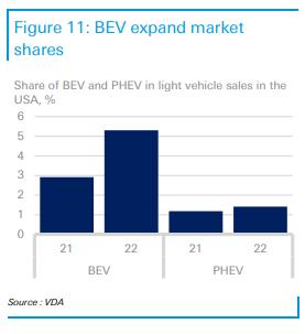 電動汽車在美國仍是一個小眾市場,但美國的監(jiān)管框架有所改善。與整體市場相比,德國品牌在美國電動汽車市場的份額相當(dāng)高,2022年為11%。