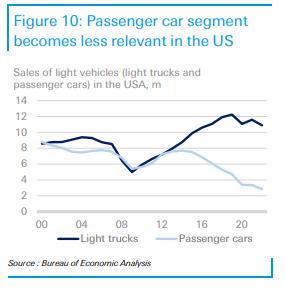 2022年,輕型車銷量(包括輕型卡車和乘用車)在美國下降了8%,約為1380萬輛。利率上升、供應(yīng)鏈持續(xù)中斷和燃料價格上漲是造成這一現(xiàn)象的主要因素。前幾年,輕型車的銷量已經(jīng)呈下降趨勢。新冠肺炎疫情導(dǎo)致2020年美國市場大幅下滑,至今仍未復(fù)蘇。
