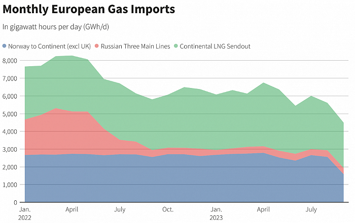 上圖顯示,歐洲天然氣價(jià)格在經(jīng)歷俄烏沖突、北溪檢修、北溪爆炸等不同階段之后,已有半年時(shí)間徘徊在50歐元/兆瓦時(shí)的下方,不到高點(diǎn)的六分之一,接近2021年水平。