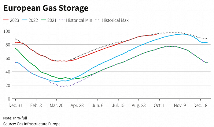 放在過(guò)去,沒(méi)有什么能夠比戰(zhàn)爭(zhēng)、罷工、停產(chǎn)這樣的突發(fā)事件更能影響能源等大宗商品價(jià)格的了。大宗商品商都會(huì)以此作為投資套利的工具。然而,即使罷工這樣的消息,也已經(jīng)無(wú)法動(dòng)搖經(jīng)歷過(guò)大風(fēng)大浪考驗(yàn)的歐洲天然氣的大勢(shì)。所以,《貿(mào)易經(jīng)濟(jì)學(xué)》同時(shí)指出,盡管天然氣價(jià)格出現(xiàn)短期上漲,但由于10月份天氣預(yù)測(cè)溫和、需求下降以及庫(kù)存水平較高,本周天然氣價(jià)格的整體趨勢(shì)顯示,下跌仍超過(guò)9%。目前,歐洲的儲(chǔ)氣設(shè)施容量已超過(guò)96%,并且仍在持續(xù)注入天然氣。另外,歐洲工業(yè)需求在不斷減少。以上這些都有助于維持相對(duì)穩(wěn)定的天然氣價(jià)格。