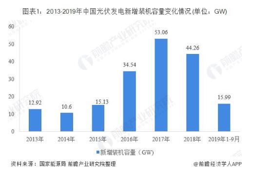 我國太陽能光伏行業(yè)雖起步較晚,但發(fā)展迅速,尤其是2013年以來,在國家及各地區(qū)的政策驅(qū)動(dòng)下,太陽能光伏發(fā)電在我國呈現(xiàn)爆發(fā)式增長,據(jù)國家能源局統(tǒng)計(jì)數(shù)據(jù)顯示,2017年,我國光伏發(fā)電新增裝機(jī)容量為53.06GW,創(chuàng)歷史新高,2018年,受光伏531新政影響,各地光伏發(fā)電新增項(xiàng)目有所下滑,全年新增裝機(jī)容量為44.26GW,同比下降16.6%。截至2019年9月底,全國光伏發(fā)電新增裝機(jī)15.99GW。