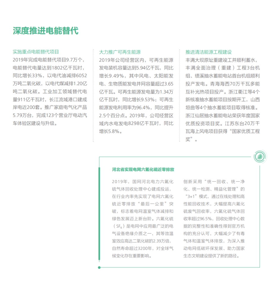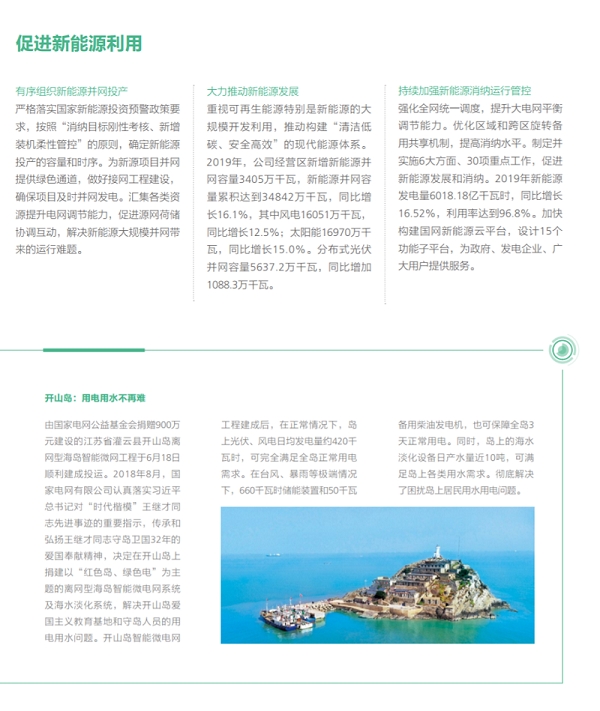 在努力做綠色發(fā)展的表率方面,國家電網(wǎng)有限公司認(rèn)真貫徹落實(shí)綠色發(fā)展理念,全力推進(jìn)生態(tài)文明建設(shè),推動(dòng)能源更高質(zhì)量、更可持續(xù)發(fā)展,以綠色低碳高效的充足電能,全力服務(wù)美麗中國建設(shè)。2019年經(jīng)營區(qū)新增新能源并網(wǎng)容量3405萬千瓦,新能源并網(wǎng)容量累積達(dá)到34842萬千瓦,同比增長16.1%,新能源云平臺(tái)接入新能源場站55萬余座、裝機(jī)容量2.3億千瓦,累計(jì)交易額754.3億元,帶動(dòng)產(chǎn)業(yè)鏈上下游3000余家企業(yè)協(xié)同發(fā)展;完成電能替代項(xiàng)目9.7萬個(gè),電能替代電量達(dá)到1802億千萬時(shí),“煤改電”配套電網(wǎng)建設(shè)惠及19684個(gè)村、372萬戶居民,以電代油減排二氧化碳6052萬噸,以電代煤減排二氧化碳1.20億噸;智慧車聯(lián)網(wǎng)平臺(tái)累計(jì)接入充電樁43萬個(gè),充電量達(dá)14.82 億千瓦時(shí),同比增長73.86%。