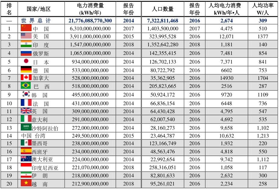 電力消費(fèi)最高的20個(gè)國(guó)家