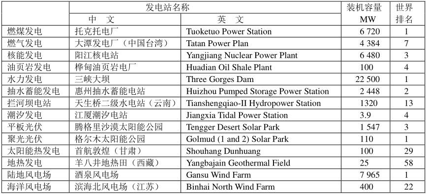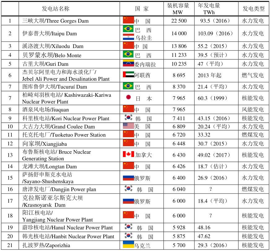 全球前20位發(fā)電站的順序是隨著時(shí)間而變化的,下表是最新的排序。目前全球20席中,中國(guó)占有六席:水力發(fā)電占有4席:三峽大壩、溪洛渡大壩、向家壩和龍灘大壩;燃煤發(fā)電占一席:托克托電廠;核能發(fā)電占一席:陽(yáng)江核電站。