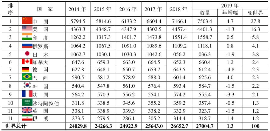 2014~2019年主要國(guó)家的發(fā)電量(單位:TWh)