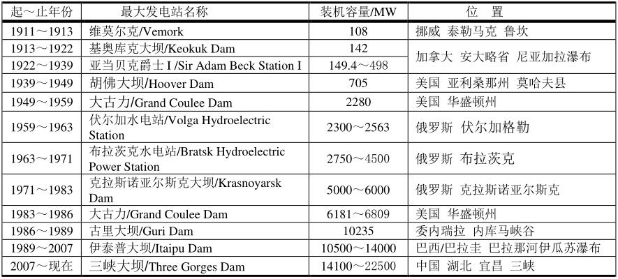 目前世界上前20座發(fā)電站仍然被水力發(fā)電霸了11席。當(dāng)今世界最大的發(fā)電站仍然是中國(guó)三峽水電站(Three Gorges Dam),該發(fā)電站采用了32臺(tái)弗蘭西斯水輪機(jī)(Francis turbines),每臺(tái)功率700MW,另外還有兩臺(tái)50MW渦輪機(jī)發(fā)電,裝機(jī)容量共計(jì)22500MW。它是世界上最大的核電站—日本柏崎刈羽核電站(Kashiwazaki-Kariwa,7965MW)的兩倍多。2017年正在建設(shè)的中國(guó)白鶴灘水電站(Baihetan Dam,16000MW)和巴西貝羅蒙特大壩(Belo Monte Dam,11233MW),都無(wú)法跟三峽水電站的裝機(jī)容量比擬。