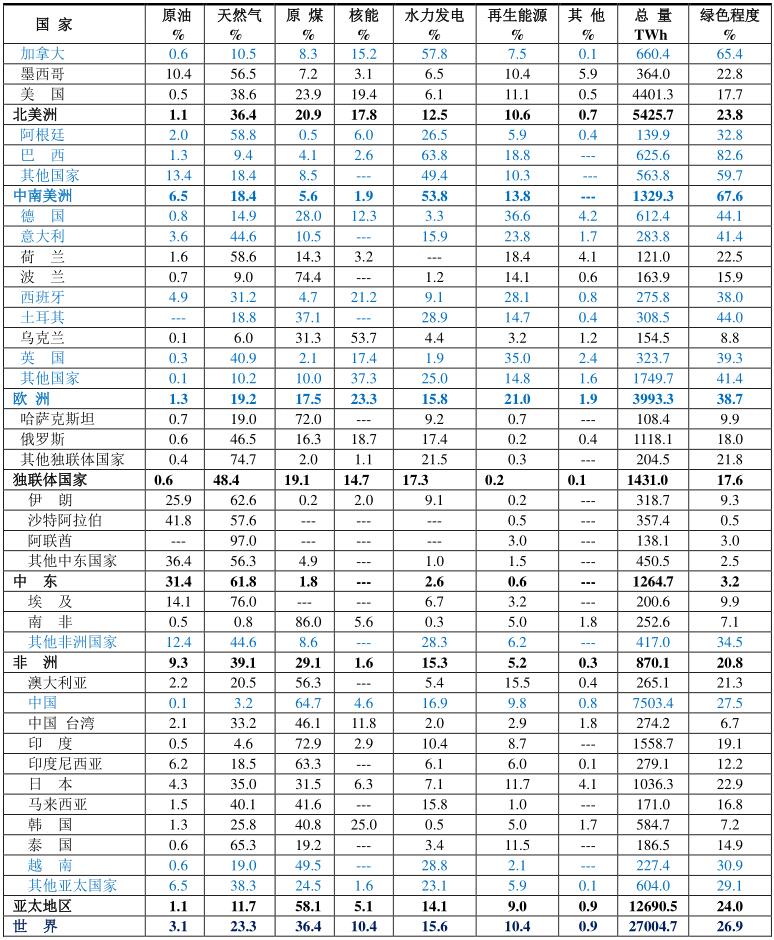本資料根據(jù)BP 2020年報(bào)告的數(shù)據(jù),再經(jīng)過計(jì)算而成。本文所指的化石燃料是原油、天然氣和原煤構(gòu)成;非再生能源由化石燃料和核燃料構(gòu)成。綠色能源由水力發(fā)電、再生能源和“其他”構(gòu)成。“其他”指抽水蓄能、城市廢物發(fā)電等。綠色程度為水力發(fā)電、再生能源和“其他”的水力發(fā)電、再生能源和“其他”的%之和,用%表示。表中藍(lán)色表示這些國(guó)家綠色程度超過了世界平均值26.9%。