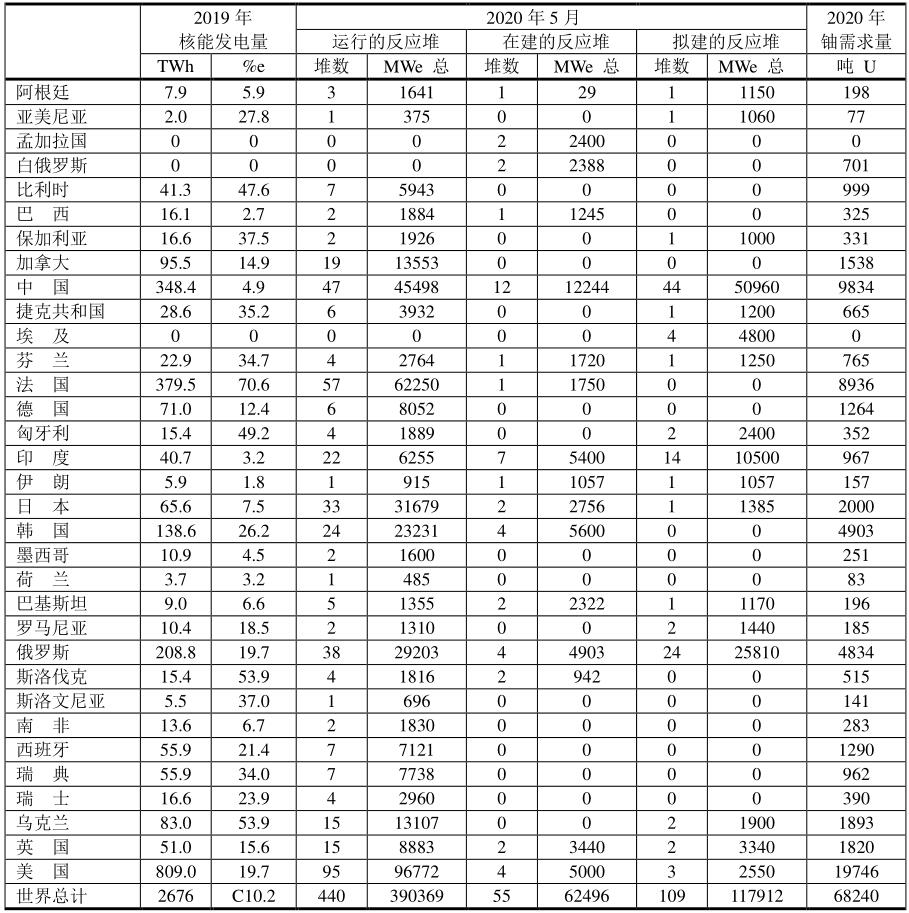 表中“%e”表示核能發(fā)電占發(fā)電總量的百分率。全球核能發(fā)電占全球發(fā)電總量的10.2%,其中法國高達(dá)70.6%。本數(shù)據(jù)是世界核能協(xié)會WNA 2020年5月份提供的數(shù)據(jù)。