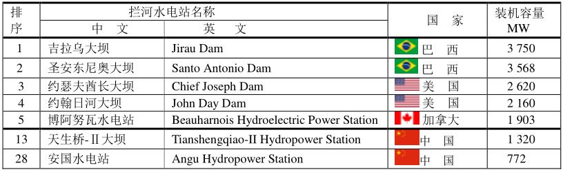 全球徑流式水電站第一位是巴西的“吉拉烏大壩”,美國的“約瑟夫酋長大壩”已經從第一位降低到第三位。中國最大的徑流式水電站是天生橋-Ⅱ大壩,世界排序13,裝機容,1320MW。