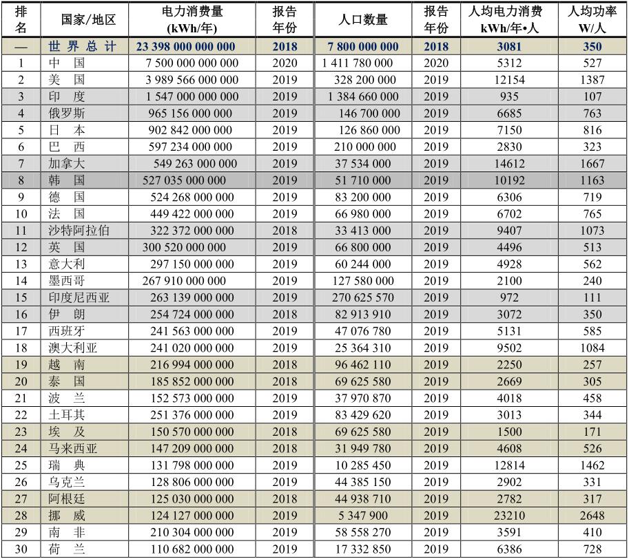 電力消費(fèi)最高的前30個(gè)國家
