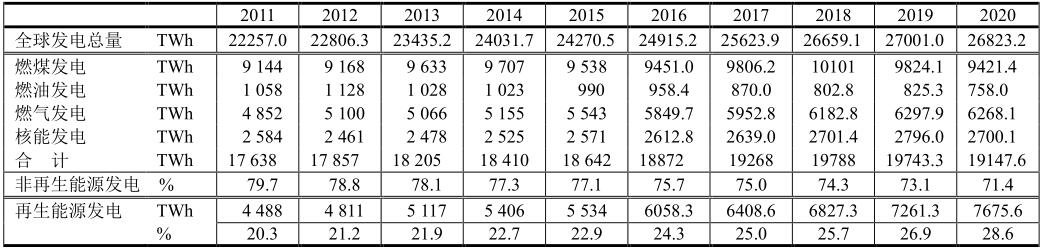 2011~2020年全球電力結(jié)構(gòu)匯總