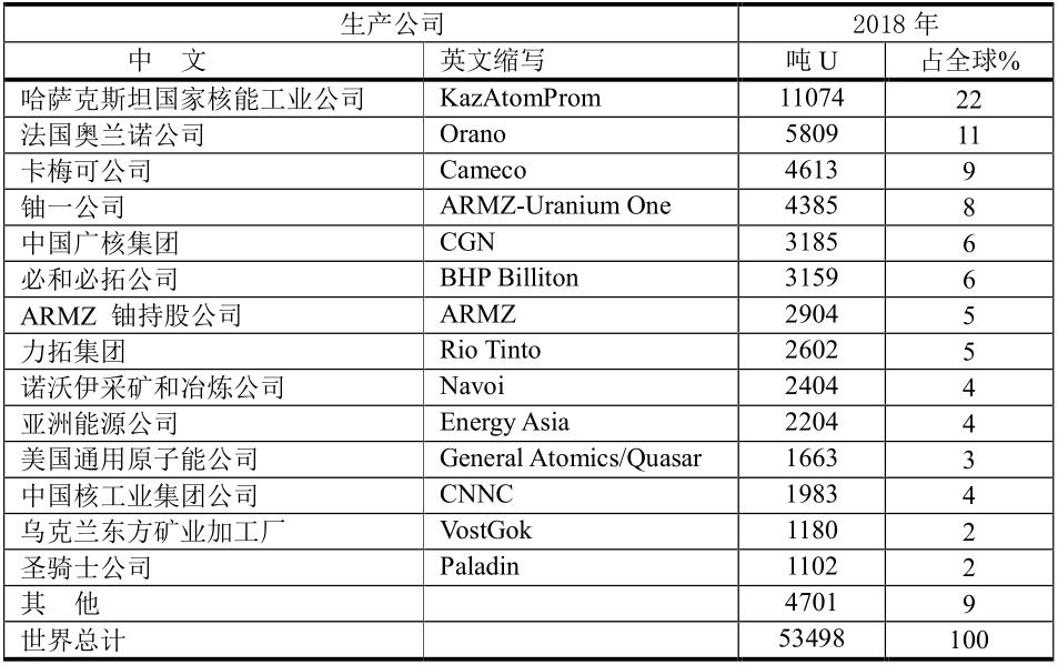 2018年世界鈾生產(chǎn)主要公司