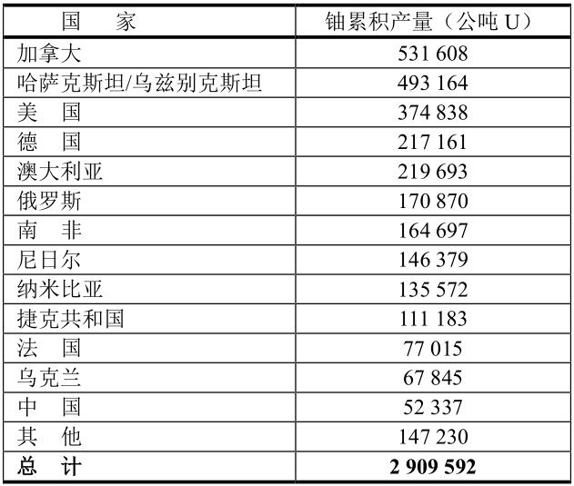 本數(shù)據(jù)是世界核能協(xié)會(huì)(WNA)于 2020年12月份提供的從鈾礦生產(chǎn)(公噸U)的數(shù)據(jù)。