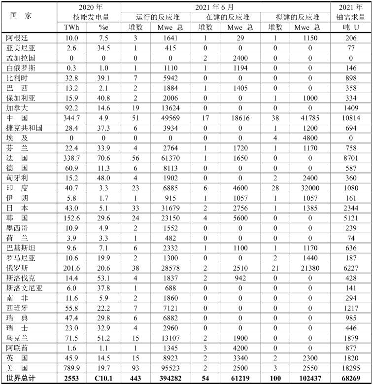 表中“%e”表示核能發(fā)電占發(fā)電總量的百分率。全球核能發(fā)電占全球發(fā)電總量的10.1%,其中法國高達(dá)70.6%。本數(shù)據(jù)是世界核能協(xié)會(huì)WNA 2021年1月份提供的數(shù)據(jù)。