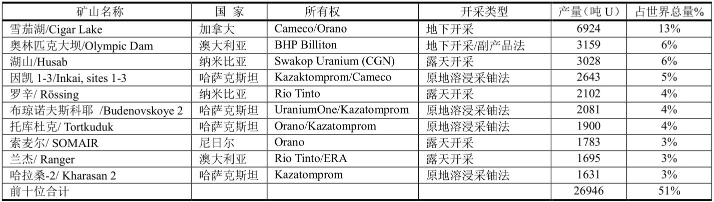 2018年世界十大鈾礦占據(jù)了全球總產(chǎn)量的51%。雖然加拿大雪茄湖居產(chǎn)量之首,但哈薩克斯坦占了4席。
