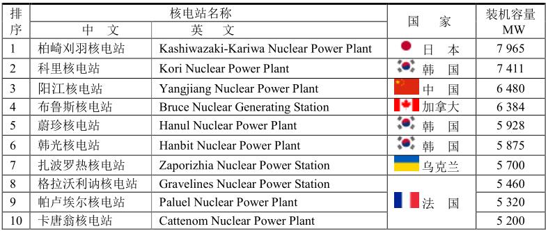 世界上最大的核電站是日本柏崎刈羽核電站,裝機(jī)容量為7965MW,但2011年已經(jīng)停工。值得注意的是韓國核電站進(jìn)展很快,前十位核電站就占有3席,把美國和日本都甩到后面。