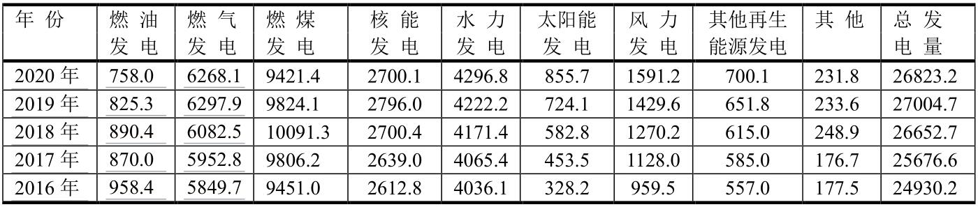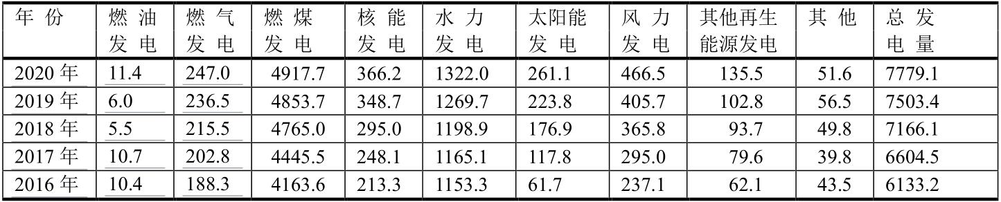 就中國發(fā)電而論,2020年燃煤發(fā)電居首位,占中國發(fā)電總量的4917.7/7779.1=63.2%;其次為水力發(fā)電、風(fēng)力發(fā)電、核能發(fā)電和太陽能發(fā)電。盡管中國燃?xì)獍l(fā)電量居世界第三位,但在中國發(fā)電總量中居第六位247.0/7779.1=3.2%。