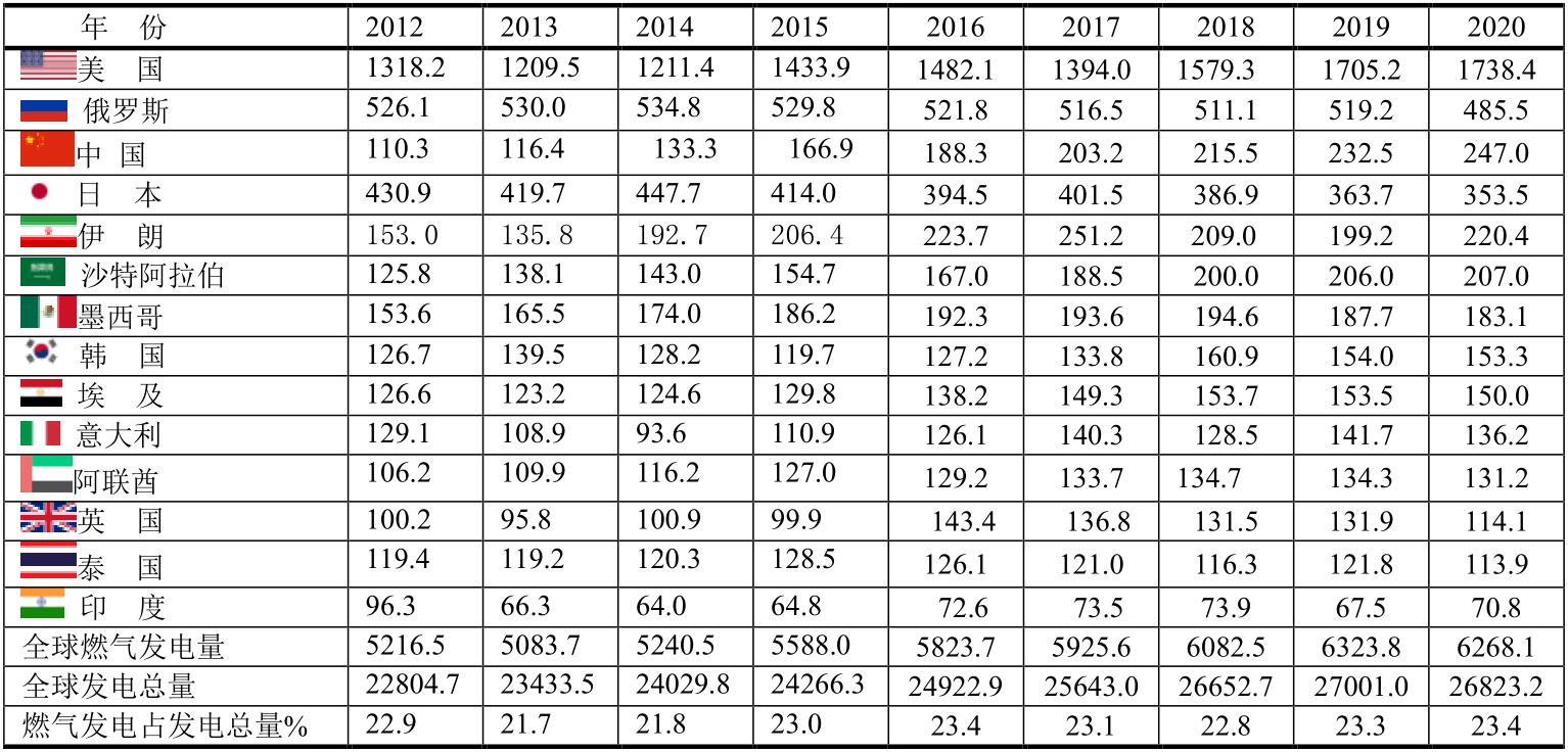 就全球發(fā)電而論,2020年燃煤發(fā)電居首位,占全球總量的9421.4/26823.2=35.1%;燃?xì)獍l(fā)電只居全球第二位,占全球總量的6268.1/26823.2=23.4%。