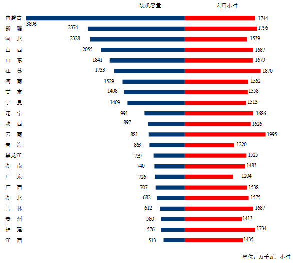 圖3 1-9月份風(fēng)電裝機(jī)較多省份風(fēng)電裝機(jī)容量和設(shè)備利用小時(shí)