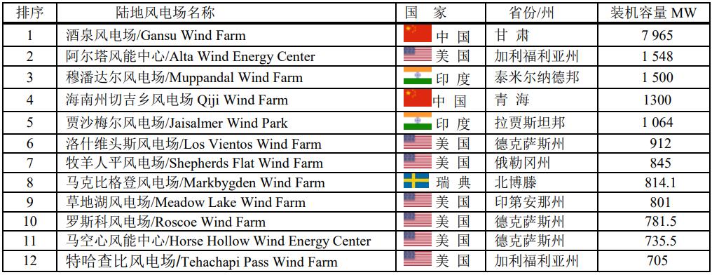 全球最大的前12大的陸上風電場,美國最多,占7座。盡管中國風力發(fā)電量居全球之首,僅占2座。