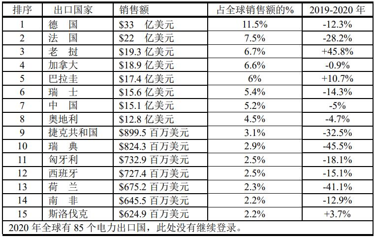 按價(jià)值計(jì)算,列出的15個(gè)國(guó)家2020年出口的電力占全球出口的71.2%。