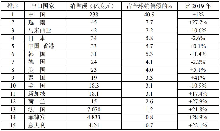 太陽(yáng)能發(fā)電產(chǎn)品的五大出口國(guó)依次是中國(guó)、越南、馬來(lái)西亞、日本和中國(guó)香港。按價(jià)值計(jì)算,這五個(gè)主要出口國(guó)在2020年出口了大約三分之二(67.3%)的太陽(yáng)能產(chǎn)品。