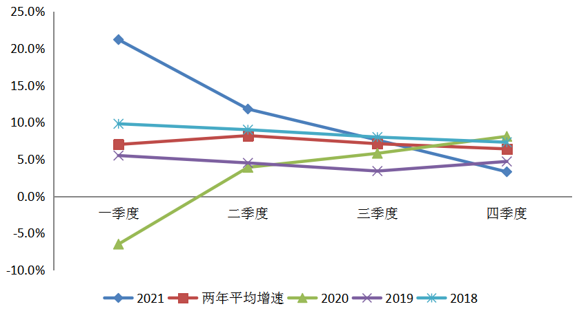 主要受到經(jīng)濟(jì)持續(xù)穩(wěn)定恢復(fù)和二產(chǎn)用電增長的拉動,一季度全社會用電量較快增長,拉動全年用電量同比增長4.5個百分點(diǎn),較2019年同期增長14.4%。受能耗雙控和堅(jiān)決遏制“兩高”項(xiàng)目盲目發(fā)展政策、同期基數(shù)抬升等因素影響,季度用電增速呈現(xiàn)“前高后底”態(tài)勢。通過對比可以看出,從2021年各季度兩年平均增速來看,增速略高于2019年,在2018和2019年之間。