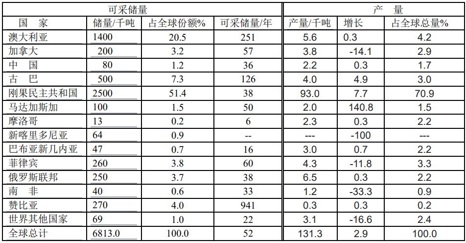 1、 鈷:世界上鈷可采儲(chǔ)量最多的國(guó)家依次為剛果民主共和國(guó)和澳大利亞,占全球總量的71.9%。中國(guó)為全球第九位。鈷生產(chǎn)量最多的國(guó)家為剛果民主共和國(guó),占全球總量的70.9%。中國(guó)鈷生產(chǎn)量?jī)H為全球第十位。