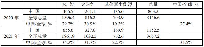 ?、?在再生能源中風(fēng)電場(chǎng)和光伏發(fā)展得最快,其價(jià)格已被用戶接受。根據(jù)BP 2022年報(bào)告,得出下表。中國(guó)風(fēng)能和光伏發(fā)電發(fā)電進(jìn)展迅速,2021年中國(guó)占全球總量的27.4%,而同期美國(guó)為17.1%.
