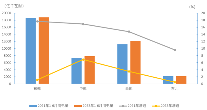 1-6月,東、中、西部和東北地區(qū)②全社會(huì)用電量分別為18794、7844、12104和2235億千瓦時(shí),增速分別為1.1%、6.9%、3.5%和0.5%。