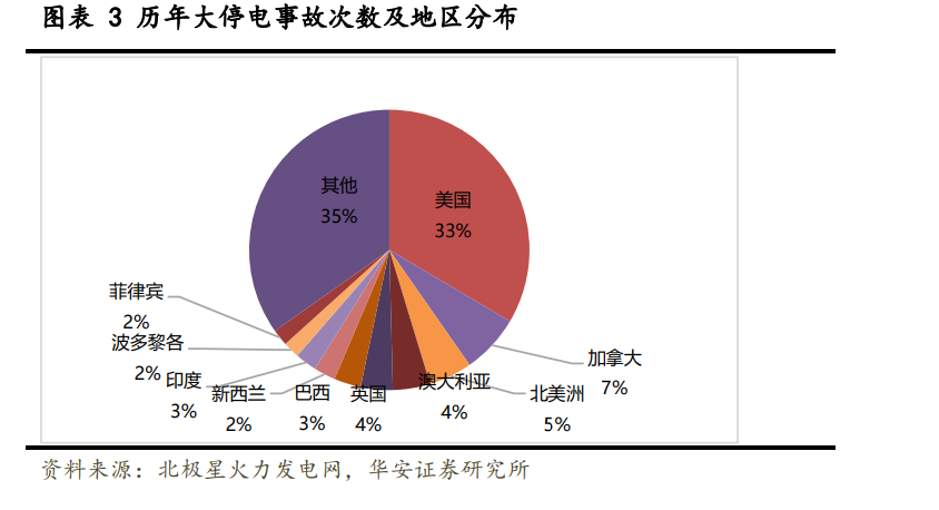 新能源發(fā)電設備在過程中,外部環(huán)境不能確保設備可以持續(xù)穩(wěn)定發(fā)電,存在一定的 隨機性。儲能系統可以對隨機性、間歇性和波動性的可再生能源發(fā)電出力進行平滑控制, 從源頭降低波動性,滿足可再生能源并網要求,為未來大規(guī)模發(fā)展應用打好基礎。全球 范圍內具有突發(fā)性、影響范圍超過 10 萬人、停電時長>1h 的大停電事故屢屢發(fā)生,美 國、加拿大、澳大利亞、巴西、印度等國家大停電事故發(fā)生次數最多,普遍具有國土面 積遼闊、供電跨度大、電力運行工況復雜的特點。北美電網系統設施老舊,亞非拉地區(qū) 缺乏強大電力設施建設投入,導致斷電、缺電現象頻發(fā),疊加氣候變暖、寒潮、龍卷風、 高溫干旱等極端氣候多發(fā),當地居民對緊急備電需求屬于剛需。戶用家儲在電廠事故或 者極端自然災害事件中提供應急電源,提高用電穩(wěn)定性。全球分布式光伏和戶用家儲仍 處于低水平起步階段,大部分地區(qū)光儲滲透率在 10%以下,發(fā)展空間大。
