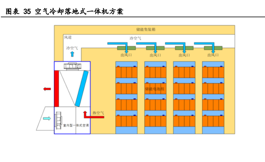 風冷溫控系統(tǒng)一般由儲能溫控廠商直接提供整體系統(tǒng)產(chǎn)品,其中核心部件包括壓縮 機、風機、換熱器等。風冷具備方案成熟、成本低、結構簡單等優(yōu)點,但同時由于空氣 的比熱容低,導熱系數(shù)低,風冷一般應用于功率較低場景。
