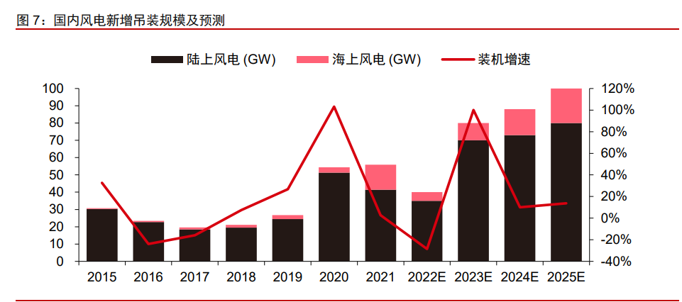 風電:受疫情等因素影響,2022 年部分風電項目裝機將延后至 2023 年。2022 年 1-11 月,國內(nèi)風電新增并網(wǎng)量達 22.52GW(-6.8% YoY),預計全年新增并網(wǎng)規(guī)模達 40GW 左 右,同比或有所回落。這主要是由于疫情影響設備生產(chǎn)交付和項目現(xiàn)場吊裝節(jié)奏,同時疊 加機型方案升級換代,以及部分項目場址審批周期拉長影響。我們預計有 10GW 左右陸上 風電項目裝機將由于外部因素由 2022 年延至 2023 年,短期裝機需求低于預期或為 2023 年需求復蘇進一步夯實基礎。隨著疫情影響逐步緩解,風電經(jīng)濟性大幅提升,以及 2022 年部分延遲項目結轉,2023 年國內(nèi)風電裝機有望顯著復蘇,預計總裝機量將達 80GW 左 右,其中海上風電裝機有望實現(xiàn)翻倍增長至 10GW 以上,且 2023-25 年海風裝機仍有望 維持約 40%的較高 CAGR。