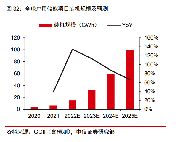 電價攀升+能源危機,推動歐洲戶儲項目經(jīng)濟性和配置意愿持續(xù)高漲。歐洲電價在近 年來天然氣價格大幅上漲情況下持續(xù)攀升,推動戶用光伏+儲能項目經(jīng)濟性顯著增強。據(jù) BNEF 統(tǒng)計,2021 年歐洲戶儲項目新增規(guī)模達 1.04GW/2.05GWh(+56%/+73% YoY)。 而 2022 年俄烏沖突進一步推升歐洲能源成本行至高位,且能源危機背景下歐洲居民配套 光儲系統(tǒng)積極性空前高漲,儲能滲透率快速提升,為未來幾年戶儲行業(yè)奠定高景氣基調(diào)。 在以歐洲為主要戶儲市場的高增長支撐下,GGII 預計全球戶儲市場容量將由 2021 年的 6.4GWh 大幅增至 2025 年的 100GWh。
