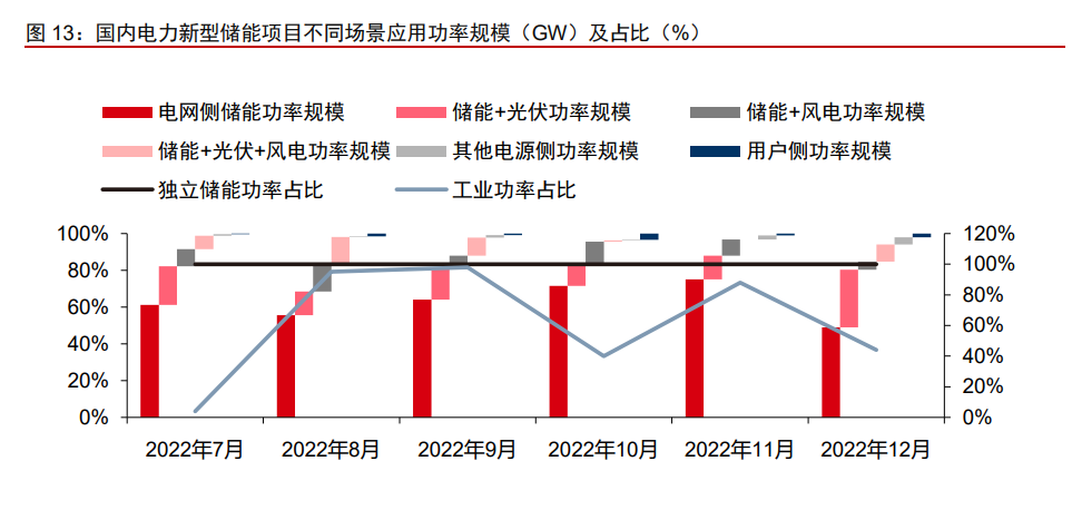 其三,電網(wǎng)側獨立儲能與電源配儲為主,用戶側工商業(yè)占比逐漸提升。從應用場景來 看,新型儲能項目主要集中于電網(wǎng)側(100%為獨立儲能)與電源側配儲(95%為新能源 配儲)。用戶側儲能項目功率規(guī)模占比仍較低,但其中工業(yè)項目占比逐步穩(wěn)定在 50%以上。
