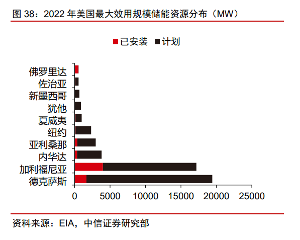 根據(jù) EIA 數(shù)據(jù),美國 2021 年電力結構中,天然氣+煤電發(fā)電量占比 60%。各州規(guī)劃 可再生能源發(fā)電市場配額方案,加州計劃 2030 年實現(xiàn) 60%的可再生能源占比。美國儲能 集中于加州和德州。截至 2022 年 8 月,加州儲能裝機完成 3977MW,在建 13198MW, 德州儲能裝機完成 1653MW,在建 17789MW。2021 年加州風+光的發(fā)電量占總發(fā)電量比 例為 25%,德州風光發(fā)電占比 24%,高于美國全國的 13%。