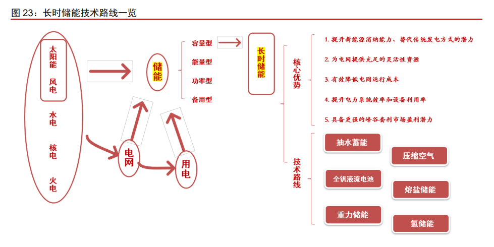 新能源滲透率快速提升,疊加其出力的不穩(wěn)定性,推升儲能市場需求,電力系統(tǒng)的儲 能應用存在多種時間尺度需求,長時儲能(一般指 4h 以上)成為儲能發(fā)展的重要方向, 在電力系統(tǒng)中具備多種優(yōu)勢——長時儲能具備提升新能源消納能力、替代傳統(tǒng)發(fā)電方式的 潛力,可以為電網(wǎng)提供充足的靈活性資源,可有效降低電網(wǎng)運行成本,具備更強的峰谷套 利和市場盈利潛力。