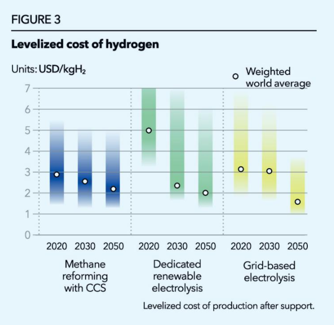 因為電解成本到2050年將顯著下降,在那個時期制氫成本將平均約為1.5美元/公斤,而且綠氫和藍氫的利用將更加普遍。
