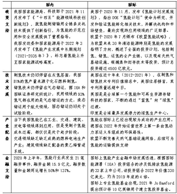 相比于國外氫能產業(yè),我國氫能產業(yè)生態(tài)尚未全面建立,主要存在四方面差異:一是政策支持,我國對于氫能產業(yè)的戰(zhàn)略布局起步較晚,2020年“雙碳”目標提出后才逐步進入市場視野。而國外部分領先國家已率先完成氫能產業(yè)的驗證、推廣及長期規(guī)劃。二是技術發(fā)展,我國在制氫、儲運、應用等關鍵領域仍面臨“灰氫”清潔利用的技術瓶頸,而國際相關技術已發(fā)展成熟并取得高質量成果,由藍氫不斷向綠氫過渡。三是產業(yè)配套,我國氫能相關配套設施及市場轉化仍有待建設完善與實踐推廣,而歐盟等國已成功將氫能投入使用。四是金融支持,金融支持氫能仍未形成完善的服務體系,融資規(guī)模較小、品種與來源單一。而國外已出現(xiàn)專業(yè)的氫投資基金,氫能行業(yè)融資市場正變得更加多元。