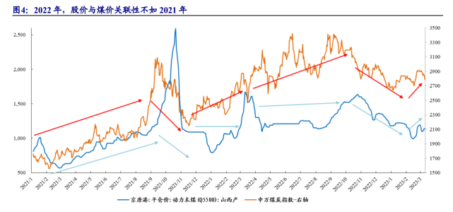 2022年,煤炭行業(yè)周期屬性弱化。2022年2月底,國(guó)家發(fā)改委發(fā)布《關(guān)于進(jìn)一步完善煤炭市場(chǎng)價(jià)格形成機(jī)制的通知》,明確了電煤中長(zhǎng)期合同價(jià)格合理區(qū)間,確立了電煤中長(zhǎng)期合同價(jià)格形成機(jī)制,通知自2022年5月1日起執(zhí)行。2022年7月,國(guó)家發(fā)改委進(jìn)一步要求電煤中長(zhǎng)期合同嚴(yán)格落實(shí)三個(gè)100%(簽約率、履約率、價(jià)格政策執(zhí)行),同時(shí),對(duì)電煤現(xiàn)貨交易價(jià)格設(shè)置價(jià)格上限。2022年,電煤長(zhǎng)協(xié)價(jià)格維持在720元/噸附近,電煤港口限價(jià)1155元/噸。2022年,在限價(jià)政策下,能源需求仍具韌性,俄烏沖突加速全球能源供需錯(cuò)配,煤價(jià)高位震蕩。隨著電煤中長(zhǎng)期合同的簽約執(zhí)行,長(zhǎng)協(xié)簽約率不斷提升,現(xiàn)貨煤價(jià)波動(dòng)性明顯減弱,股價(jià)與煤價(jià)關(guān)聯(lián)性亦減弱。從2022年股價(jià)與煤價(jià)走勢(shì)圖看,2021年12月-2022年3月,煤價(jià)走勢(shì)呈現(xiàn)“V”字型,而股價(jià)波動(dòng)上漲,2022年4-9月,煤價(jià)平緩波動(dòng),股價(jià)波動(dòng)上行并創(chuàng)年內(nèi)新高,2022年股價(jià)與煤價(jià)關(guān)聯(lián)性明顯不如2021年。電煤長(zhǎng)協(xié)價(jià)格的相對(duì)穩(wěn)定以及長(zhǎng)協(xié)簽約率的提升,必將導(dǎo)致煤企盈利趨于穩(wěn)定,煤炭行業(yè)周期屬性趨于弱化。
