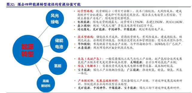 四種能源轉(zhuǎn)型路徑均提供提估值可能。煤企能源轉(zhuǎn)型方向主要有風(fēng)光綠電、儲(chǔ)能電池、氫能、高端新材料四種路徑。相關(guān)細(xì)分領(lǐng)域涉及的二級行業(yè)包括能源金屬、化學(xué)原料、化學(xué)制品、風(fēng)電設(shè)備、光伏設(shè)備、電力、電池等,選取這些細(xì)分領(lǐng)域的PE、PB與煤炭開采行業(yè)對比,可以明顯看出,不管是PE還是PB,煤炭開采行業(yè)估值均遠(yuǎn)低于其他行業(yè)。以煤企主要轉(zhuǎn)型路線的風(fēng)光綠電為例,電力行業(yè)對應(yīng)PE為25.4倍,遠(yuǎn)高于煤炭開采行業(yè)的5.8倍。四種能源轉(zhuǎn)型路徑,為煤企提供了第二增長曲線,同時(shí)均提供提估值的可能。當(dāng)前煤企盈利能力強(qiáng),現(xiàn)金流充沛,傳統(tǒng)能源轉(zhuǎn)型有望為煤企帶來業(yè)績+估值雙提升。