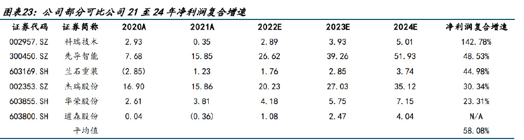 從部分有Wind一致預(yù)期的公司看,21至24年凈利潤(rùn)復(fù)合增速5家企業(yè)平均值為54.85%, 其中蘭石重裝、先導(dǎo)智能預(yù)計(jì)復(fù)合增速分別約為 45%、49%,科瑞技術(shù)高達(dá) 143%,考慮其 余企業(yè)中仍有企業(yè)有望實(shí)現(xiàn)高復(fù)合增速,公司要超過(guò) 75 分位值水平(高于第五)預(yù)計(jì)凈 利潤(rùn)復(fù)合增速較高,我們預(yù)計(jì)公司 21 至 24 年凈利潤(rùn)復(fù)合增速為 49.69%。