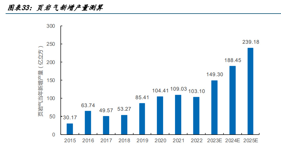 對(duì)于頁(yè)巖氣產(chǎn)量的遠(yuǎn)期預(yù)測(cè),我們結(jié)合《頁(yè)巖氣發(fā)展規(guī)劃 2016-2020》展望的 2030 年實(shí) 現(xiàn)頁(yè)巖氣產(chǎn)量 800 至 1000 億立方,與中國(guó)頁(yè)巖氣當(dāng)前勘探開發(fā)、技術(shù)進(jìn)步、設(shè)備總體形 式預(yù)測(cè),預(yù)計(jì) 25 年頁(yè)巖氣產(chǎn)量有望占到天然氣產(chǎn)量的 15%,即頁(yè)巖氣產(chǎn)量在 25 年達(dá)到 460 億方,22 至 25 年 CAGR22.62%。