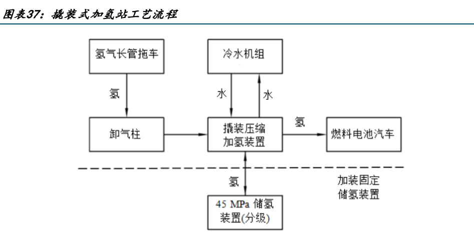 加氫站包含撬裝加氫站、固定式加氫子站、站外管道加氫母站、制氫加氫一體站: 1)撬裝加氫站:可快速完成建設(shè)并在短期投入運(yùn)營(yíng) 撬裝加氫站通過(guò)氫氣長(zhǎng)管拖車將壓力不大于 20Mpa 的壓縮氫氣運(yùn)送進(jìn)加氫站,通過(guò)卸氣柱卸氣至撬裝壓縮加氫裝置,后增壓為燃料電池車輛進(jìn)行加注(含固定儲(chǔ)氫裝置則先存入儲(chǔ) 氫裝置內(nèi))。