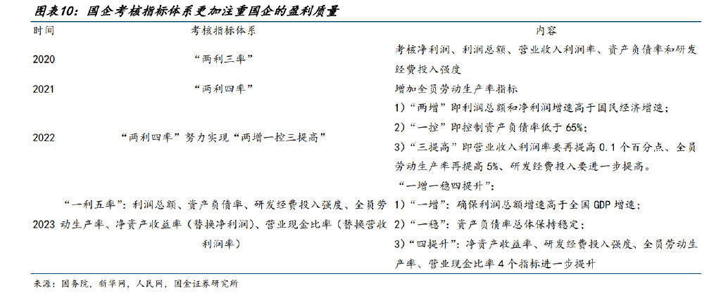 央企改革考核指標(biāo)持續(xù)優(yōu)化,新一輪改革更加重視盈利質(zhì)量、抗風(fēng)險(xiǎn)能力。新一輪央企考 核中將央企“一利五率”提出要求,即“一增一穩(wěn)四提升”,“一增”,即確保利潤(rùn)總額增 速高于全國(guó) GDP 增速,增大國(guó)資央企穩(wěn)定宏觀經(jīng)濟(jì)大盤的分量;“一穩(wěn)”,即資產(chǎn)負(fù)債率總 體保持穩(wěn)定;“四提升”,即凈資產(chǎn)收益率、研發(fā)經(jīng)費(fèi)投入強(qiáng)度、全員勞動(dòng)生產(chǎn)率、營(yíng)業(yè)現(xiàn) 金比率 4 個(gè)指標(biāo)進(jìn)一步提升,新一輪央企改革更重視新增了 ROE 和現(xiàn)金流的考核,以凈資 產(chǎn)收益率(ROE)來(lái)替代營(yíng)收利潤(rùn)率,更加契合資本市場(chǎng)的風(fēng)格。 我們認(rèn)為本輪國(guó)企改革,考核指標(biāo)更注重盈利質(zhì)量、現(xiàn)金流的考核,代表央企盈利質(zhì)量有 望優(yōu)化,進(jìn)一步提升公司競(jìng)爭(zhēng)力和經(jīng)營(yíng)質(zhì)量。