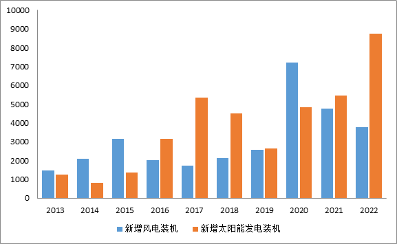 圖9 2013—2022年新增風電、太陽能發(fā)電裝機情況(單位:萬千瓦)