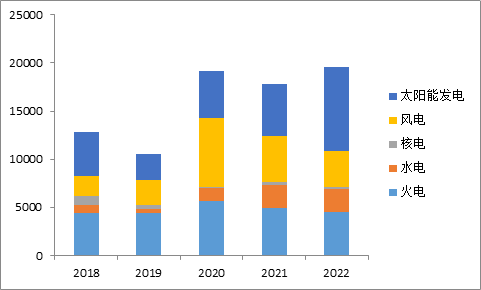 圖7 2018—2022年全國新增電力裝機結構對比(單位:萬千瓦)